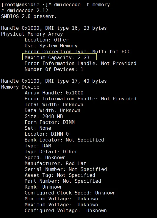 (2)free -mh命令查询的是弹性云服务器的可用内存,dmidecode -t memory 命令查询的是实际硬件内存大小(包含内核占用)。因此使用free -mh命令查询到的内存大小比实际的要小一些,属于正常情况
